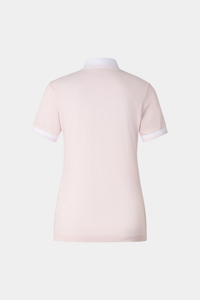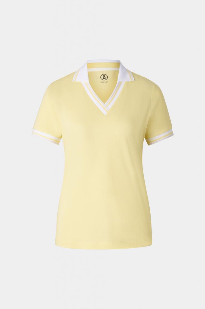 Блузка Jula выполнена в стилистике поло. Изделие выполнено из эластичной ткани пике – трикотажа с характерным фактурным рельефом, придающим модели элегантный и утонченный внешний вид. Модель приталенного кроя с отложным воротником, переходящим в женственный V-образный вырез горловины, и короткими рукавами. Отделка ворота и рукавов полосами контрастного цвета подчеркивают стиль. Принадлежность к бренду определяет логотип в виде узнаваемой буквы «В» на левом рукаве. Лаконичная модель для создания элегантных спортивных образов.