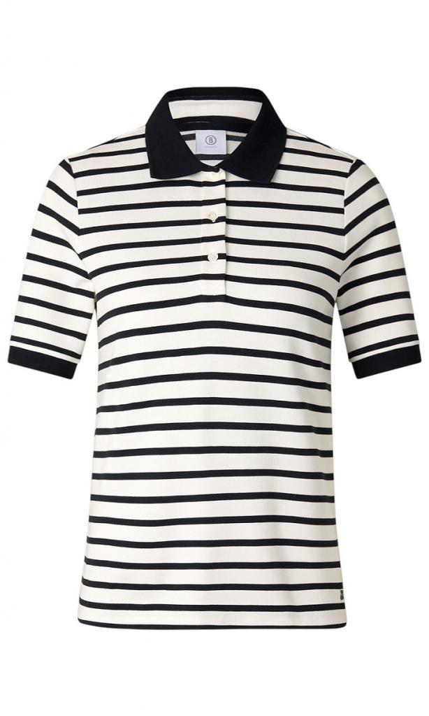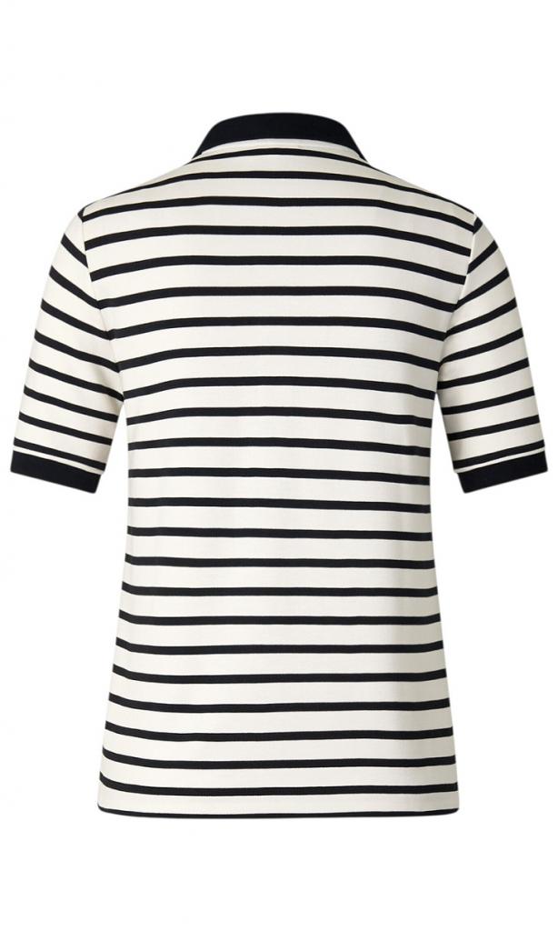 Блузка Rea в сине-белую полоску выполнена в стилистике поло из эластичной смесовой ткани на основе вискозы. Дизайн подчеркнут отложным воротником на планке с пуговицами и короткими рукавами. Принадлежность к бренду определяет логотип на подоле. Оригинальная модель для создания изысканных спортивных образов.