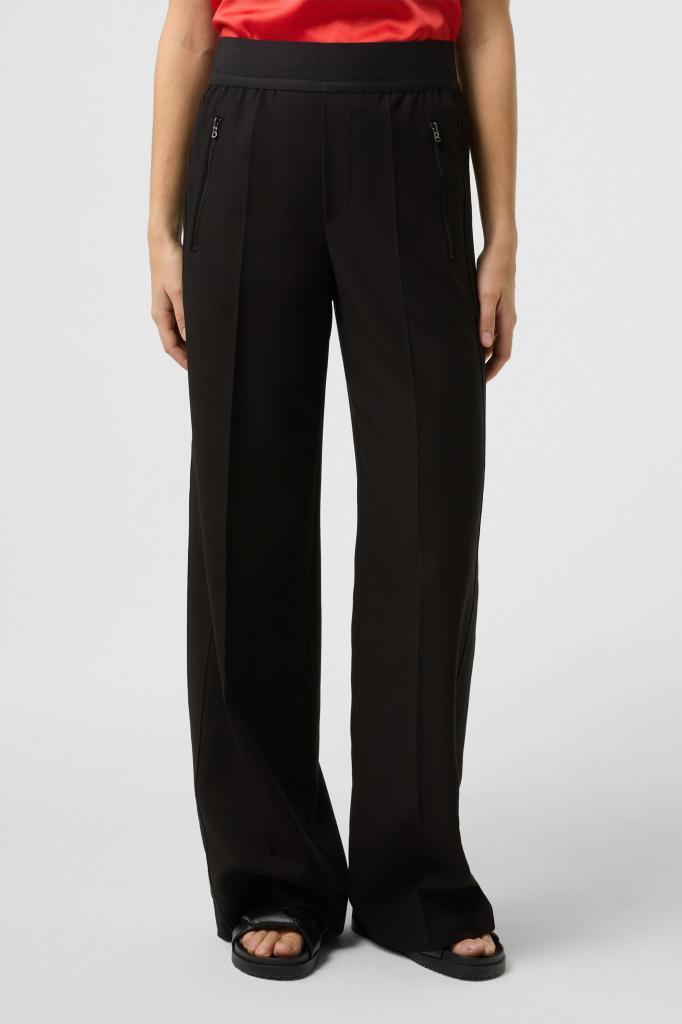 Брюки Ylvi-6 красного цвета выполнены из высококачественной смесовой ткани с добавлением вискозы. Продуманный крой с широкими брючинами и классическими стрелками, эластичный пояс, подчеркивающий талию, придают образу женственности. Изделие дополнено карманами на молнии, отстроченными лампасами и разрезами по бокам брючин.