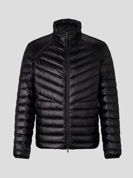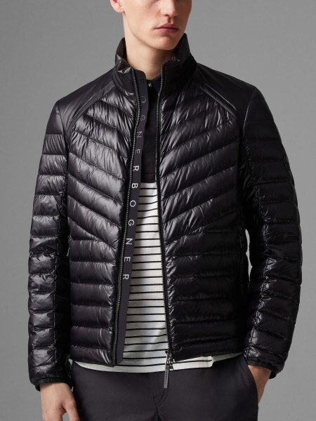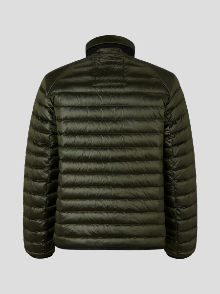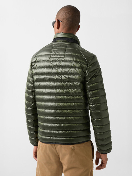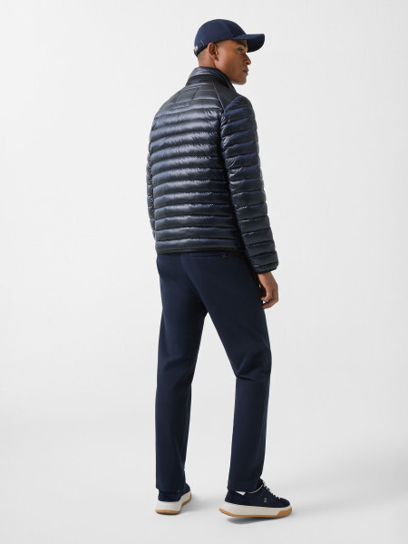 Стильное сочетание классической горизонтальной стежки и наклонной стежки на лицевой стороне, которая придает модели спортивную нотку. Воротник-стойка с сетчатой вставкой. Куртка застегивается на двустороннюю молнию с фирменным металлическим брелоком и кожаным ярлыком, укрепленная панель внутри с крупным текстурированным логотипом.