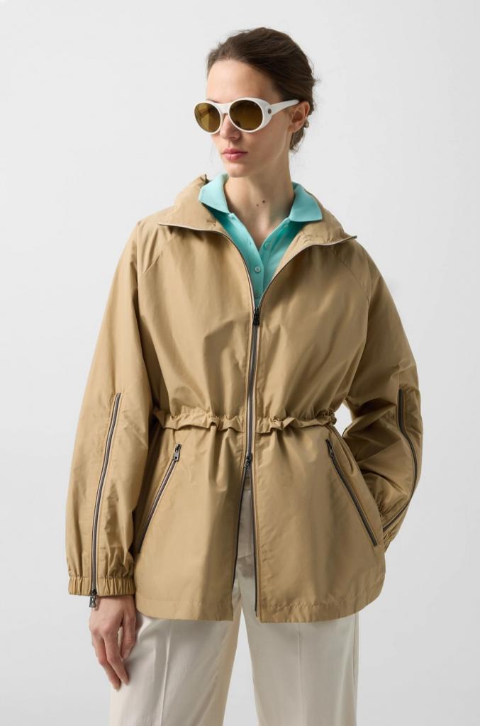 Куртка Noelle поможет создать яркий женственный образ. Модель выполнена из легкой смесовой ткани, которая хорошо пропускает воздух, не мнется, сохраняет форму и долго служит. Изделие с воротником-стойкой и длинными рукавами застегивается на удобную реверсивную молнию. Рукава с эластичными манжетами на молниях по локоть. Имеются карманы для необходимых вещей и капюшон, который можно сложить за воротник. Для создания более облегающего силуэта есть кулиска с прорезиненным шнурком и фиксаторами. Дизайнерские находки делают модель не только эффектной, но и функциональной. Куртка впишется в повседневный гардероб, подойдёт для прогулок, путешествий и активного отдыха.