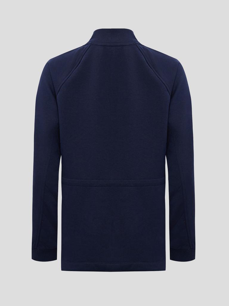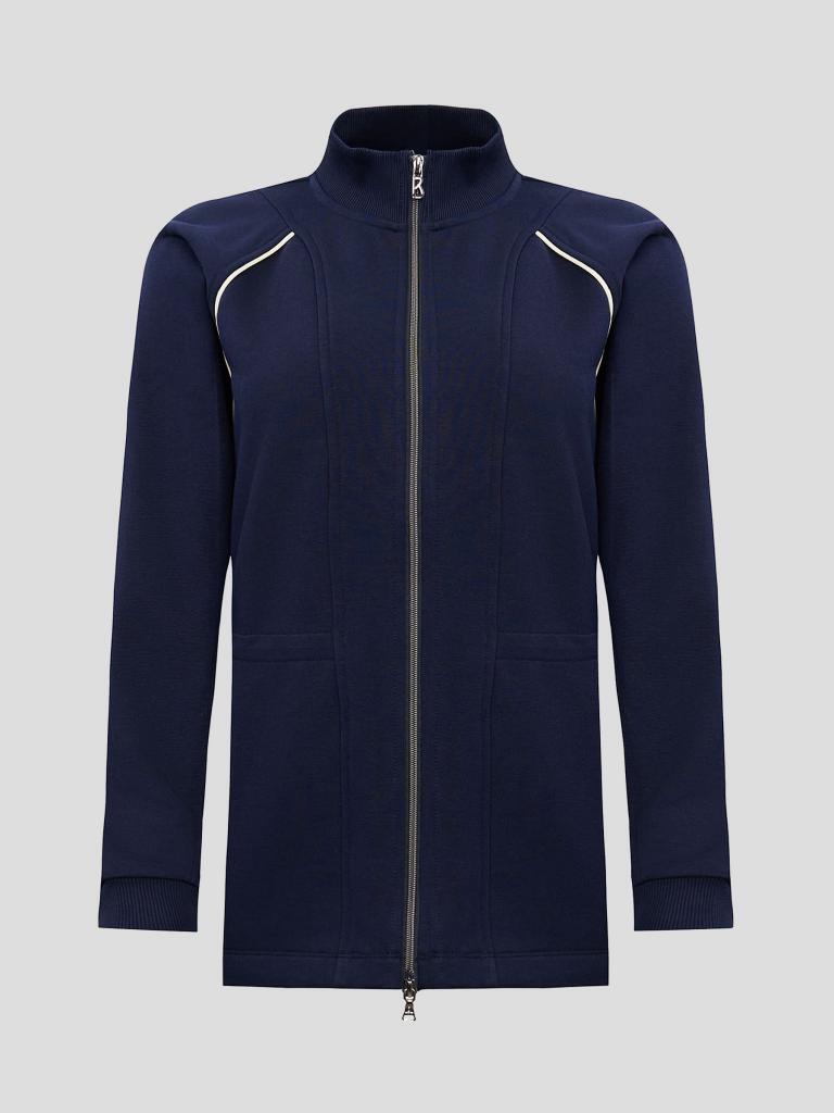 Толстовка из трикотажа на основе хлопка прямого силуэта. Внутри изделия на талии кулиска с прорезиненным шнуром, регулируемым металлизированными фиксатора с логотипом. Воротник-стойка и манжеты рукавов дополнены эластичными вставками в крупный рубчик. У фронтальной молнии два бегунка, на одном из которых металлизированный логотип в виде буквы «В». Рукав реглан выделен втачным шнуром контрастного цвета. Внутренняя часть рукава отделена отстрочкой с эффектом стеганой ткани. По бокам два кармана. Подол усилен двойным швом. По низу изделия вышит логотип в виде надписи «Bogner» нитками контрастного цвета. Сочетается с брюками Marou.